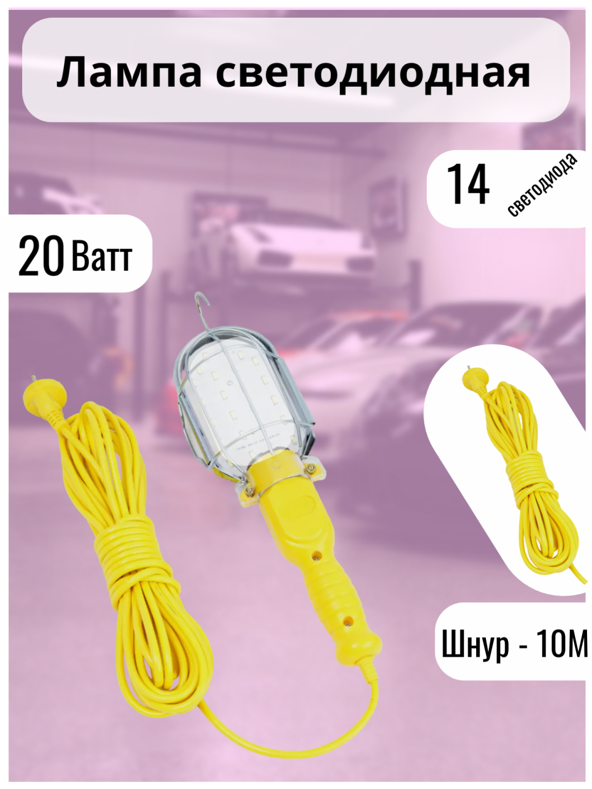 Переносная лампа мощностью 20 Вт с встроенным светодиодом (LED), напряжением 220 В и шнуром длиной 10 метров. Подходит для основного и дополнительного освещения в затемнённых помещениях, например, в гаражах, мастерских, на даче и т. д. Имеет выключатель на корпусе и крючок для подвешивания.